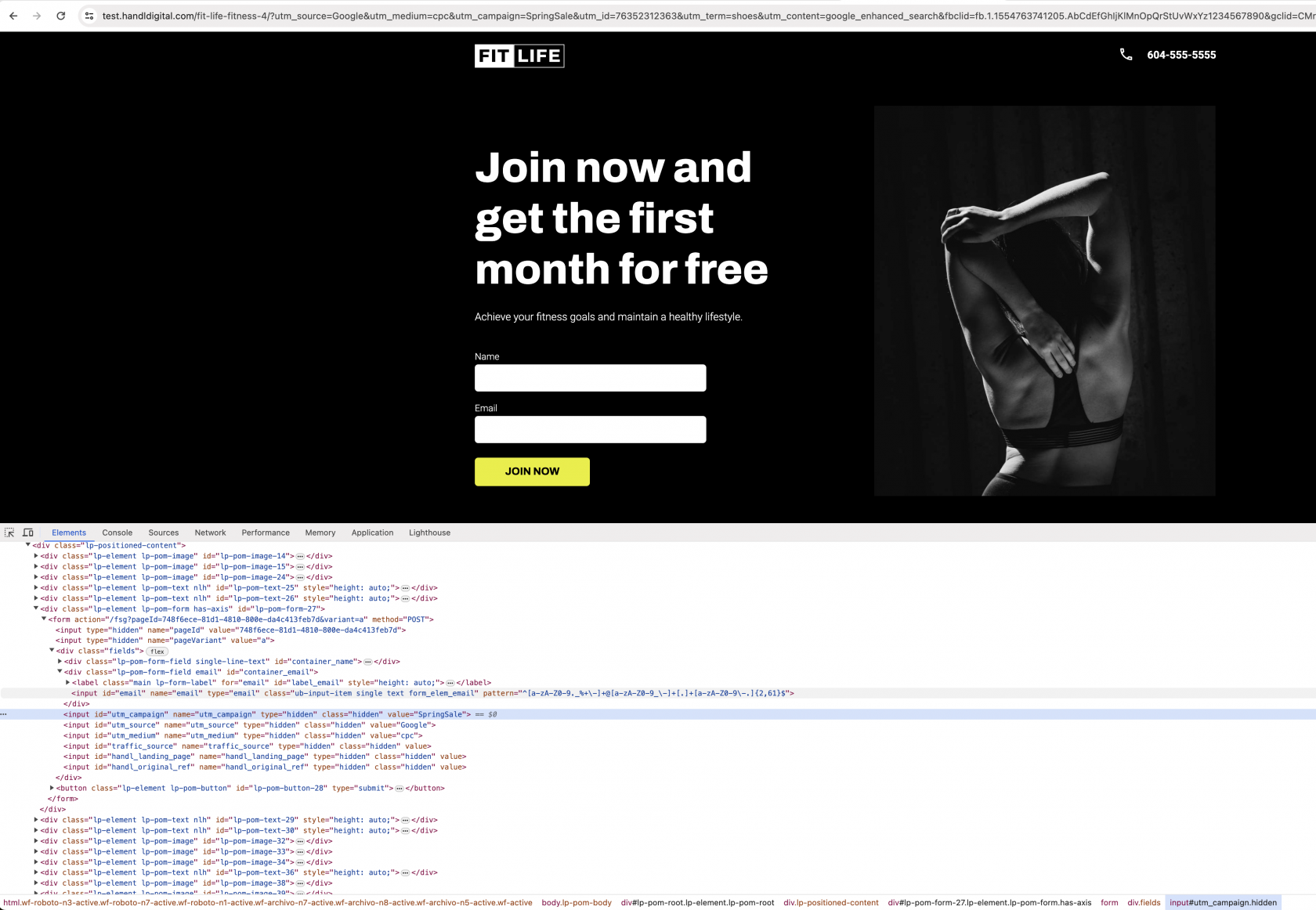After publishing your page and script, go to your website, decorate the URL with some fake UTM parameters, and check the hidden form fields using your browser's inspect element feature. You will see them populated by our script.