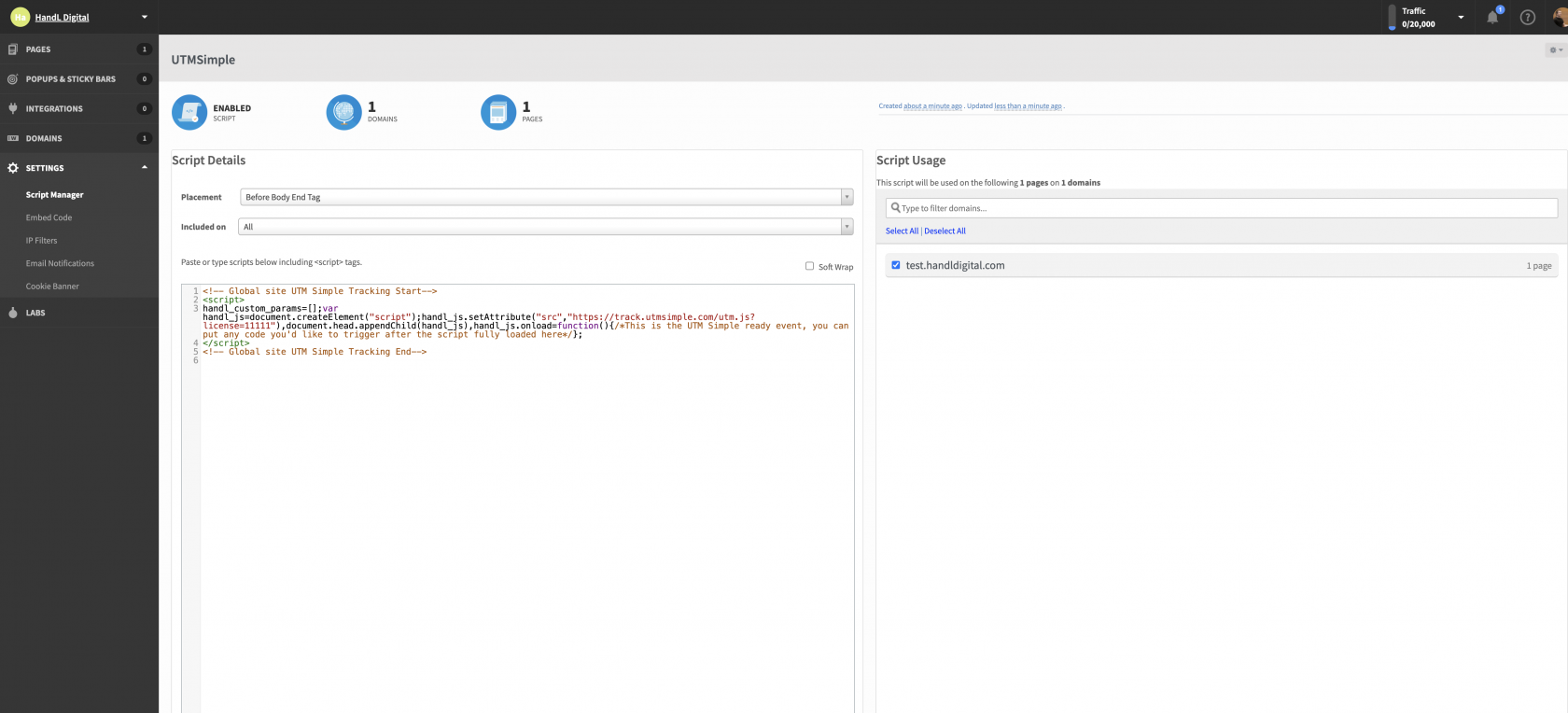 Grab your UTMSimple tracking code from your account and copy/paste it into the Script section as shown above. Select Placement as "Before Body End Tag" and Included on as "All."
